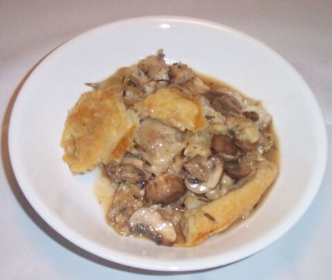 Carefully cover the chowder with the puff paste, crimping the edges of the paste to fit the shape of the stewpot. Put the paste directy over the chowder—don't lap it over the edges of the pot as you would with pie dough over a pie plate. You want to be able to remove it after it bakes.